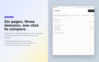 PageDiff เป็นส่วนขยาย Chrome ฟรีที่ออกแบบมาเพื่อติดตามการเปลี่ยนแปลงบนหน้าเว็บอย่างมีประสิทธิภาพ มันช่วยให้ผู้ใช้สามารถจับภาพหน้าจอรายวันของ URL ใด ๆ ทำให้เห็นได้ง่ายว่ามีการเปลี่ยนแปลงอะไรบ้างเมื่อเวลาผ่านไป ผู้ใช้สามารถเปรียบเทียบภาพหน้าจอเพื่อระบุเนื้อหาที่เพิ่มหรือถูกลบออกอย่างชัดเจน คล้ายกับฟังก์ชัน git diff เครื่องมือนี้รองรับวิธีการเปรียบเทียบที่หลากหลาย รวมถึงข้อความ, HTML, และ CSS selectors โดยเสนอความยืดหยุ่นในการติดตามการเปลี่ยนแปลง
